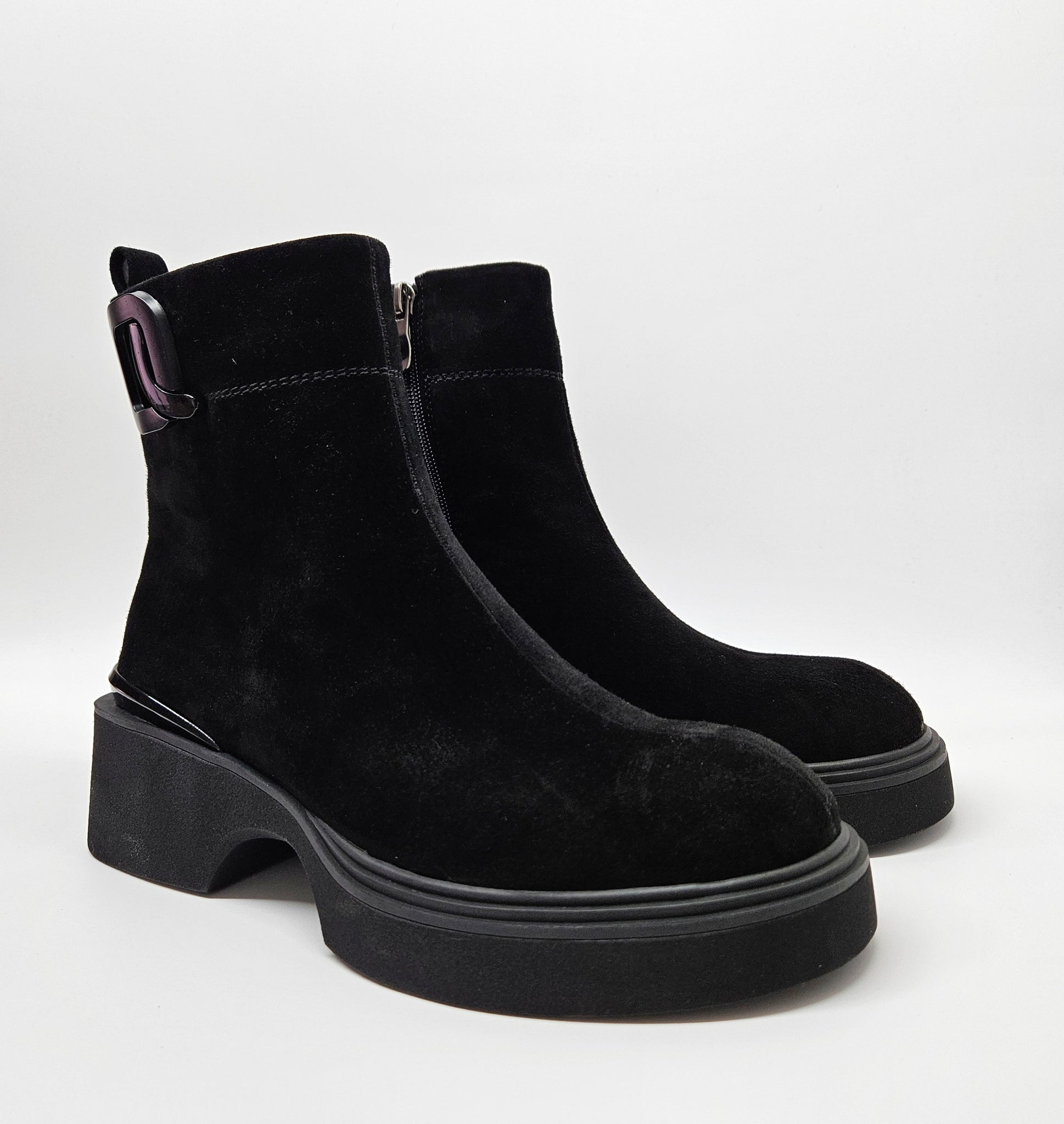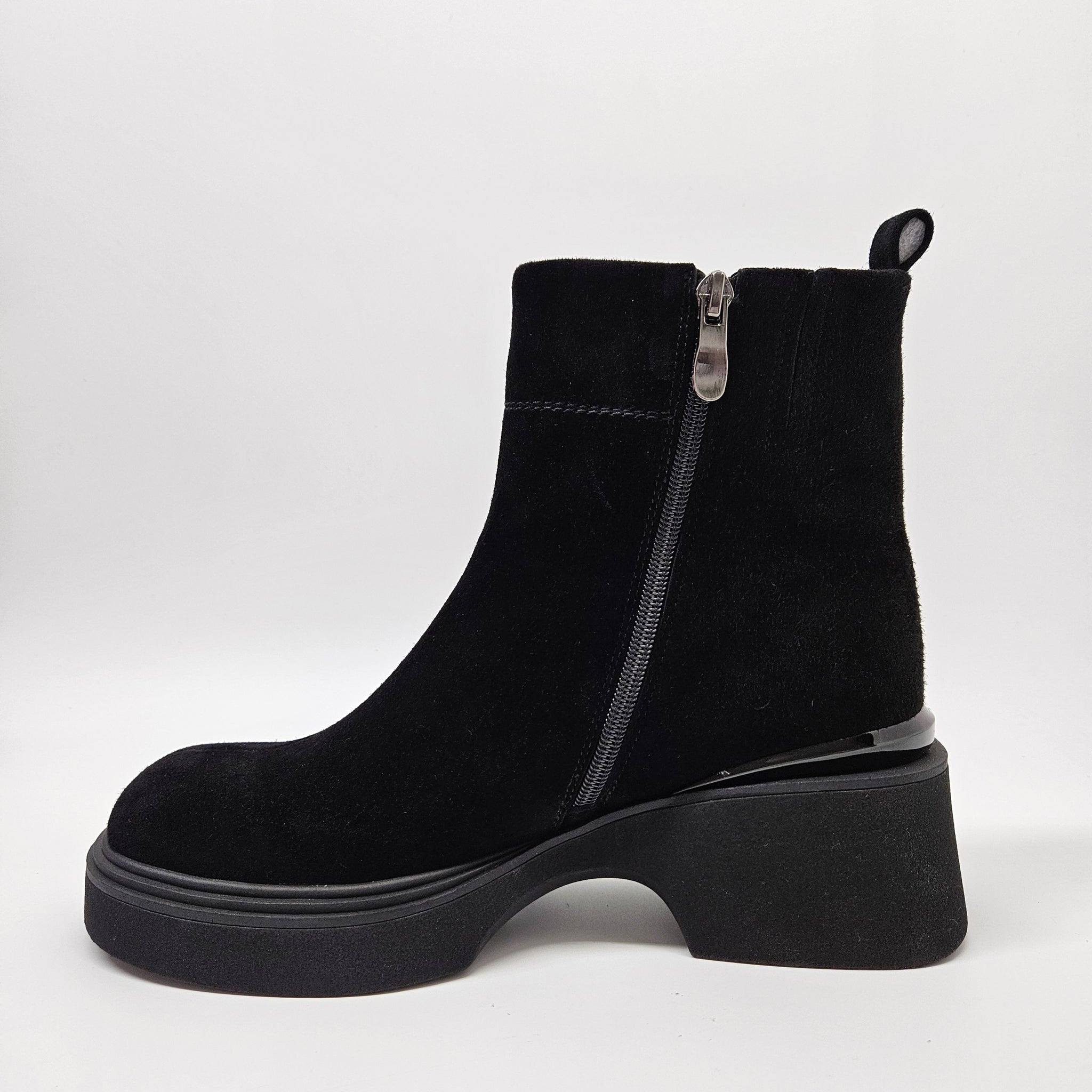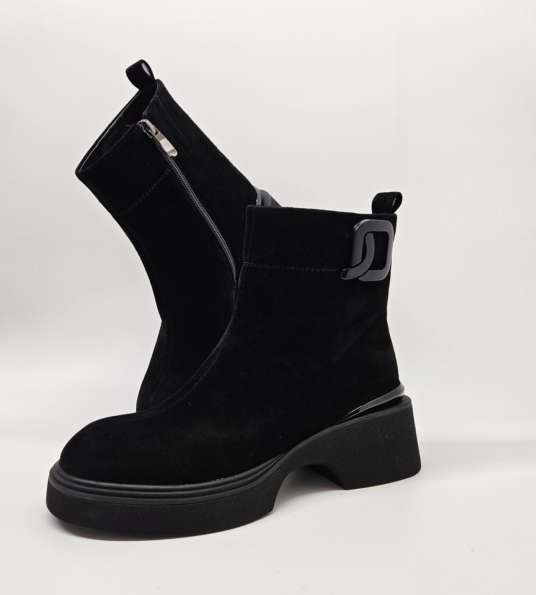 Tobuli, patogūs aulinukai. Minkštutė, zomšos oda viršutinėje aulinukų dalyje.  Tinka vidutinio pločio pėdai. Batų viduje nedidelis pašiltinimas. Vidinėje pusėje užtrauktukas. Minkštas vidpadis viduje. Pado aukštis 2,7 cm., kulno 5,5 cm., aulo aukštis 14 cm.