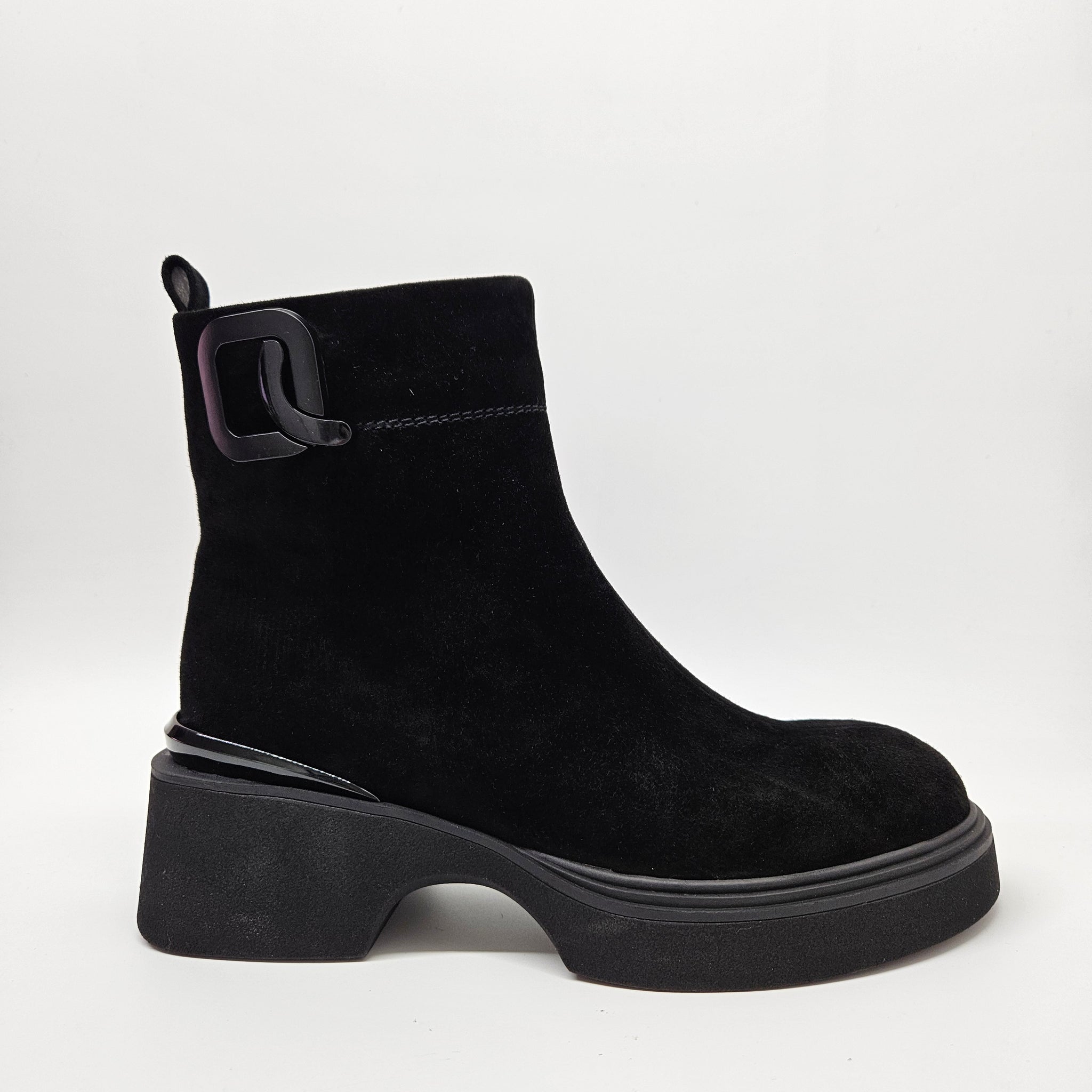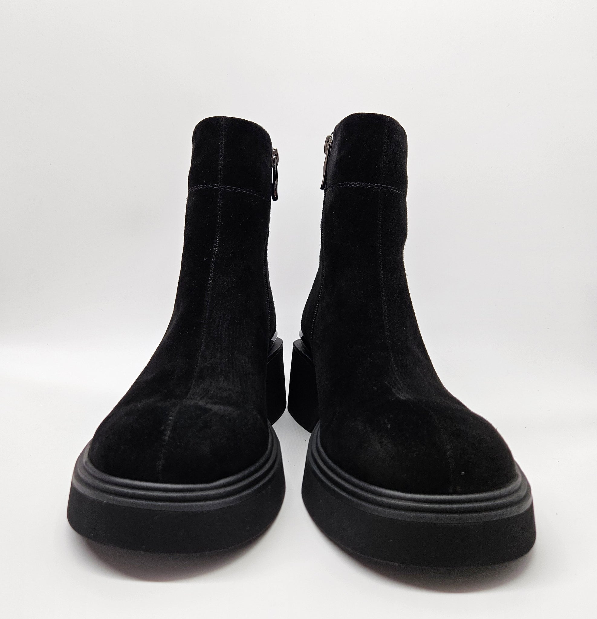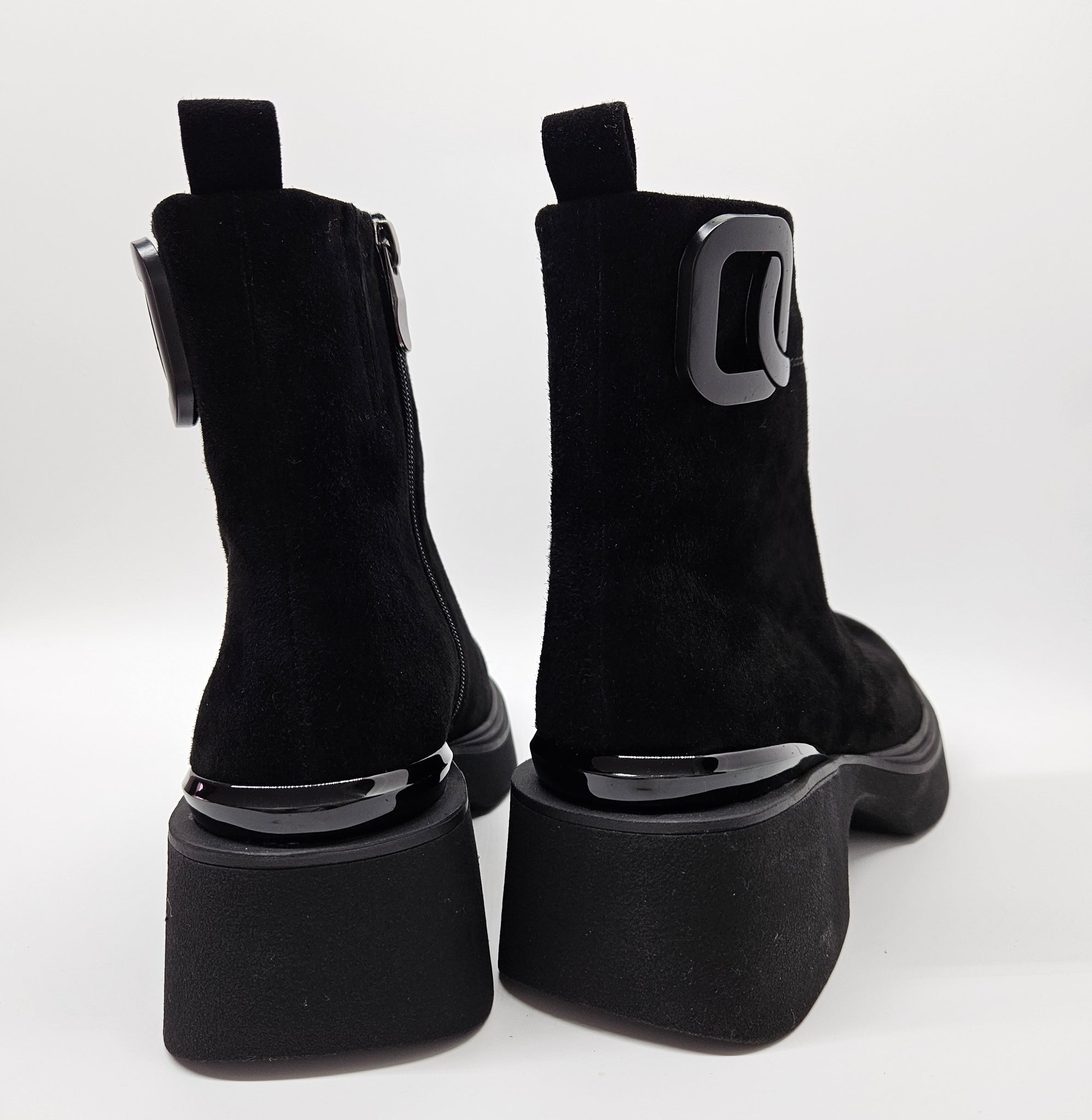 Tobuli, patogūs aulinukai. Minkštutė, zomšos oda viršutinėje aulinukų dalyje.  Tinka vidutinio pločio pėdai. Batų viduje nedidelis pašiltinimas. Vidinėje pusėje užtrauktukas. Minkštas vidpadis viduje. Pado aukštis 2,7 cm., kulno 5,5 cm., aulo aukštis 14 cm.
