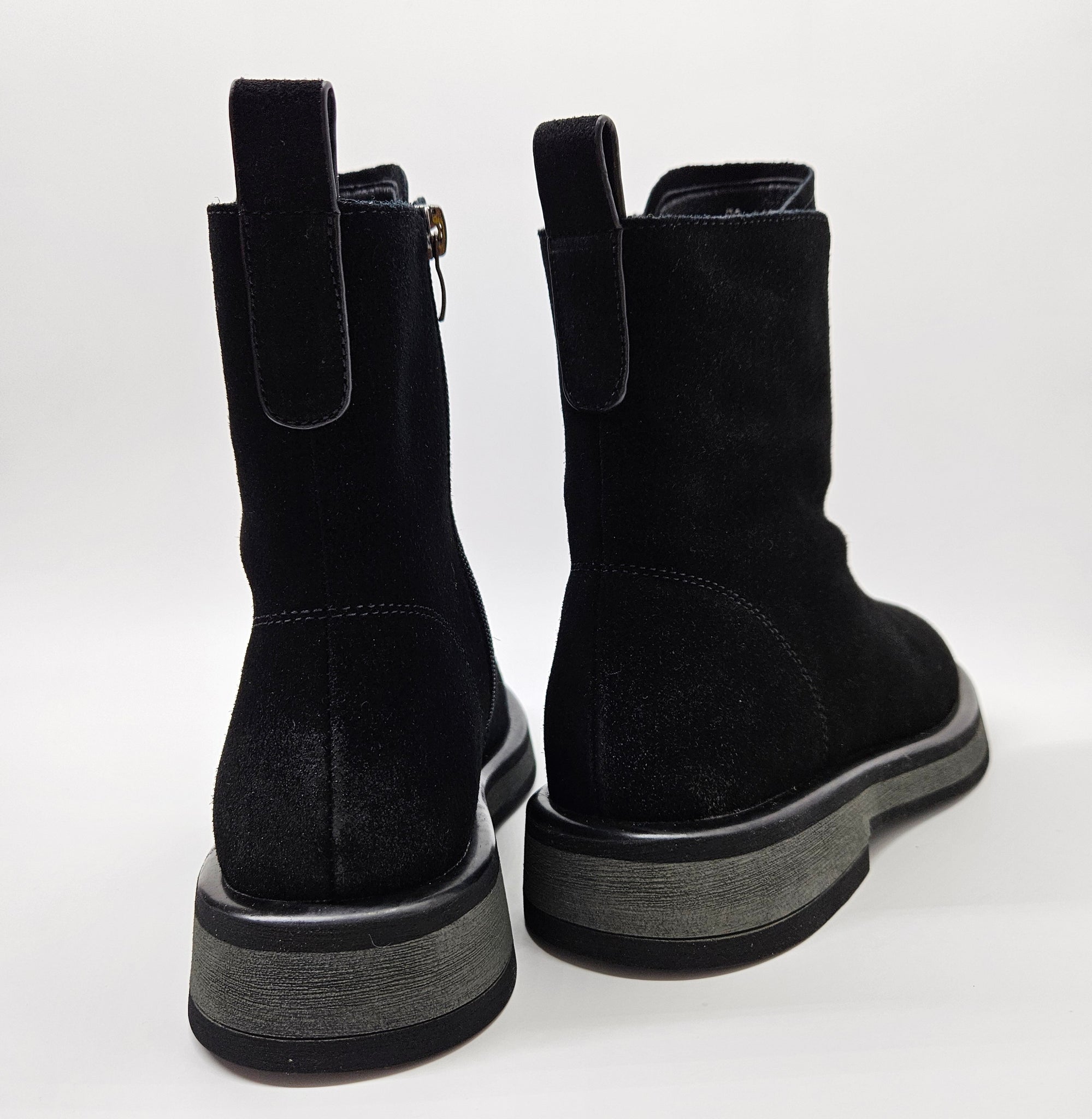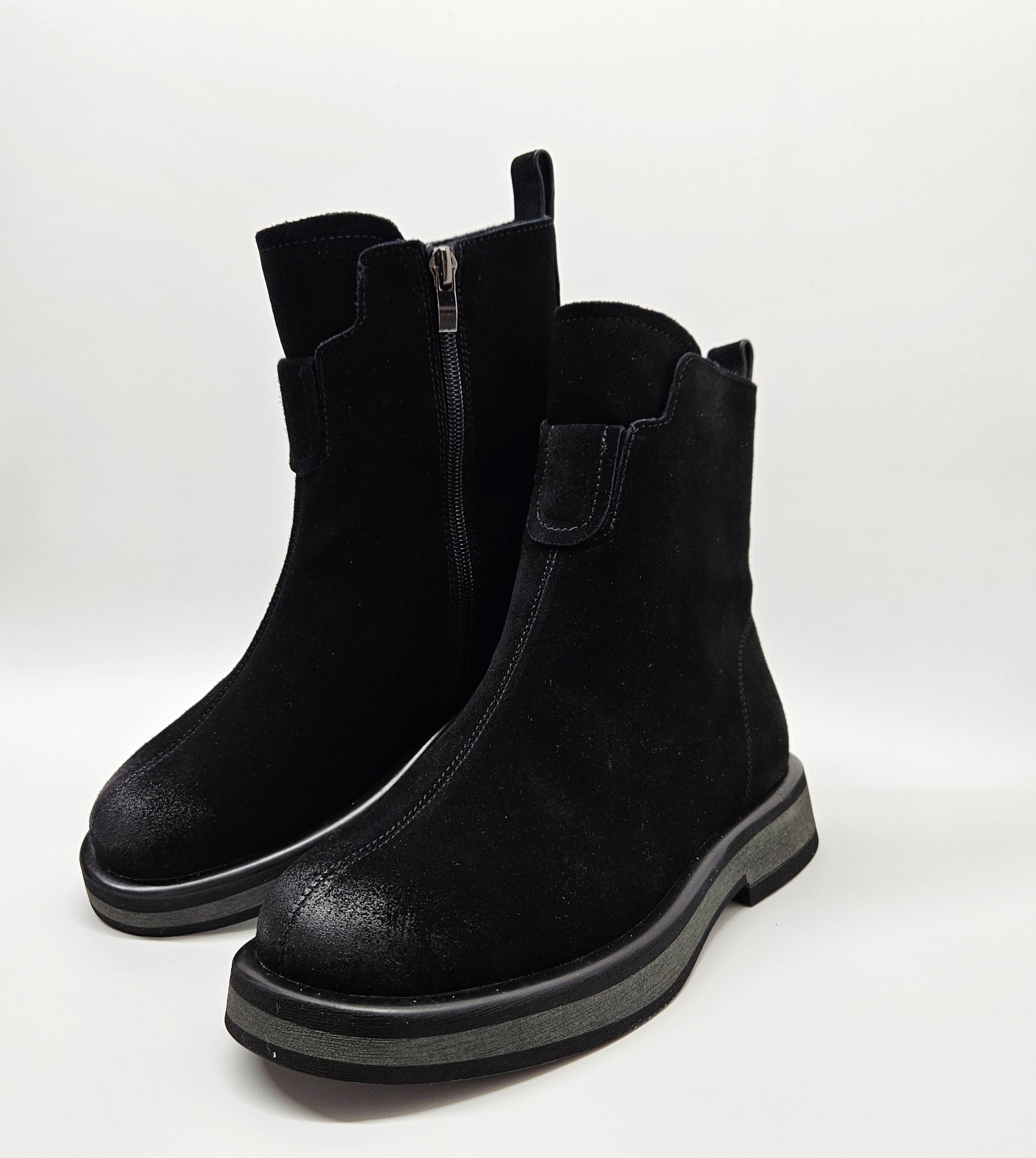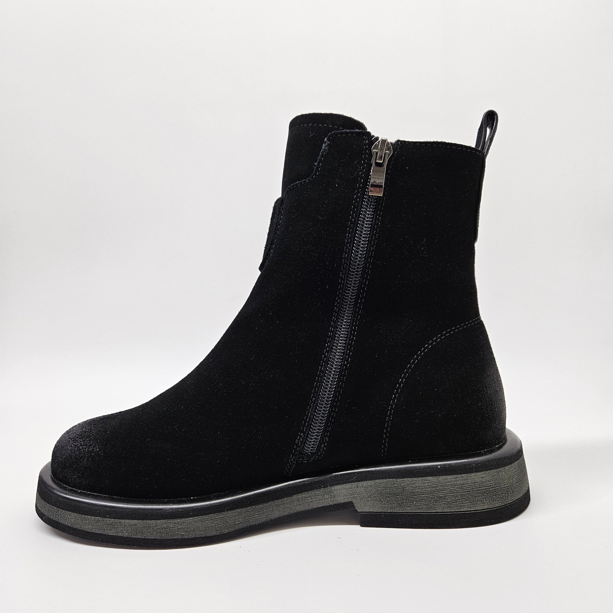 Komfortiški, minkšto, lankstaus pado batai. Minkštutė zomšos oda. Batų priekis ir kulnas užgludinti, patogesnei priežiūrai. Patogūs avėjimui ir tinka platesnei pėdai. Vidinėje pusėje - užtrauktukas. Aulinukų viduje nedidelis, švelnus pašiltinimas. Minkštas vidpadis batų viduje. Pado aukštis 2 cm., kulno 3,3 cm., auliuko 15,5 cm. Dydžiai didinti.