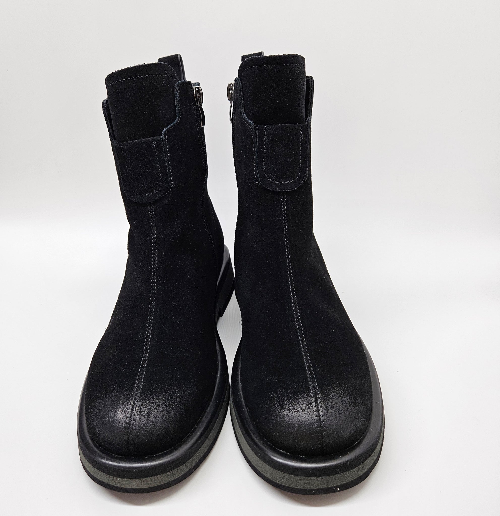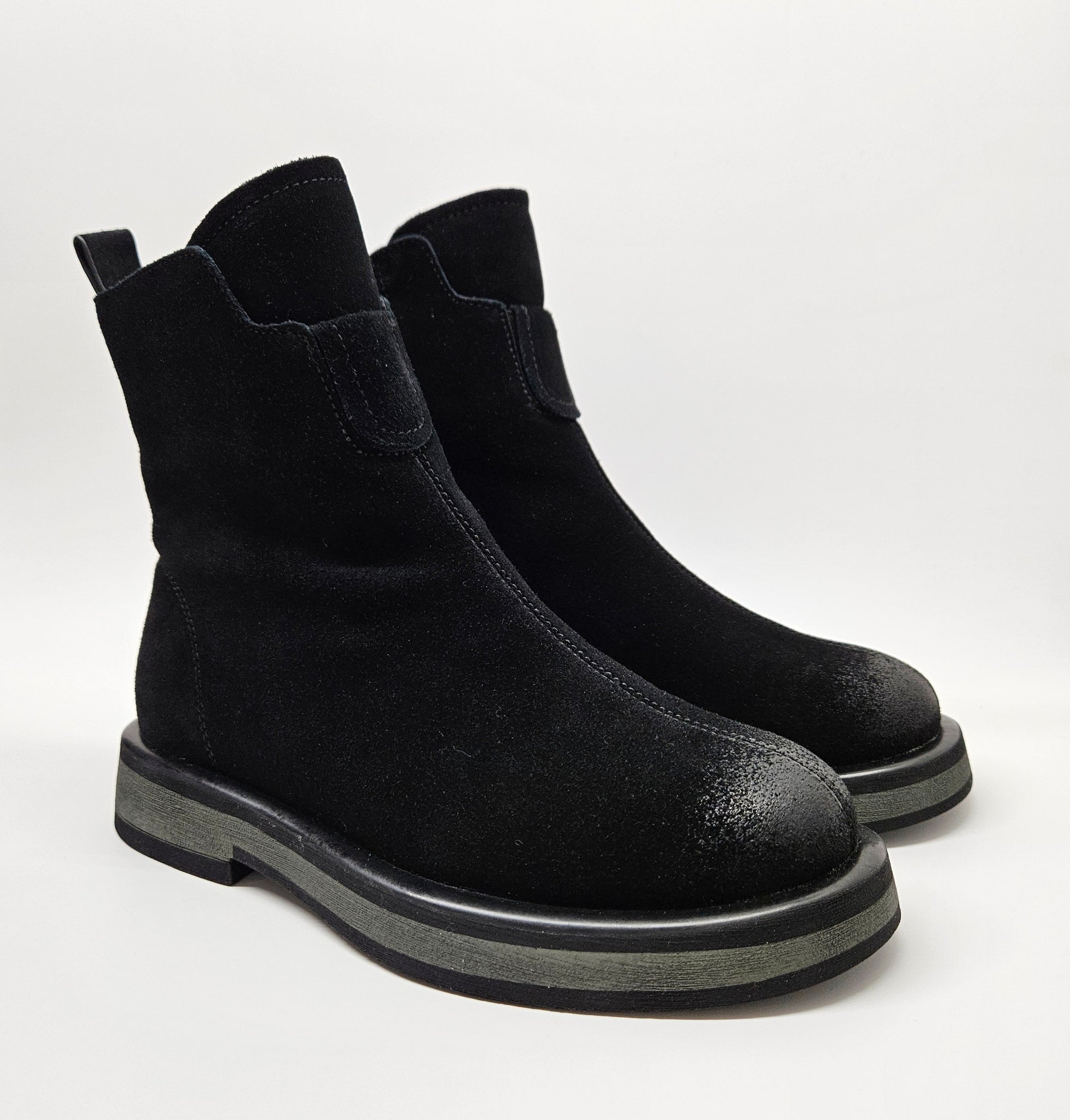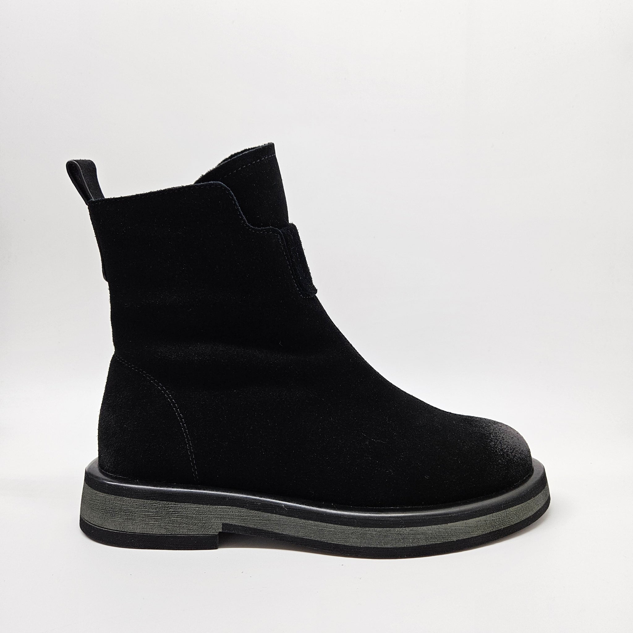 Komfortiški, minkšto, lankstaus pado batai. Minkštutė zomšos oda. Batų priekis ir kulnas užgludinti, patogesnei priežiūrai. Patogūs avėjimui ir tinka platesnei pėdai. Vidinėje pusėje - užtrauktukas. Aulinukų viduje nedidelis, švelnus pašiltinimas. Minkštas vidpadis batų viduje. Pado aukštis 2 cm., kulno 3,3 cm., auliuko 15,5 cm. Dydžiai didinti.