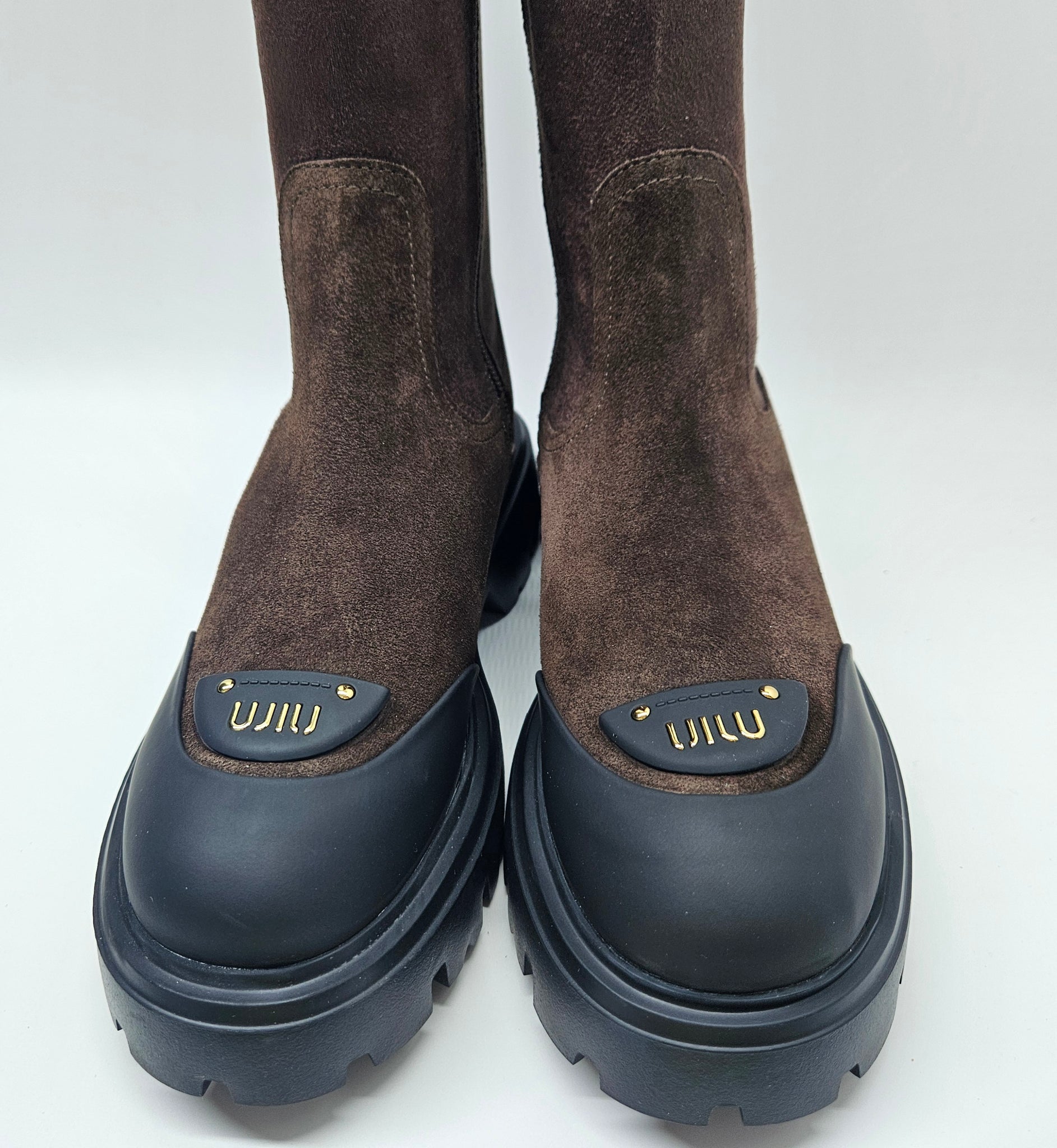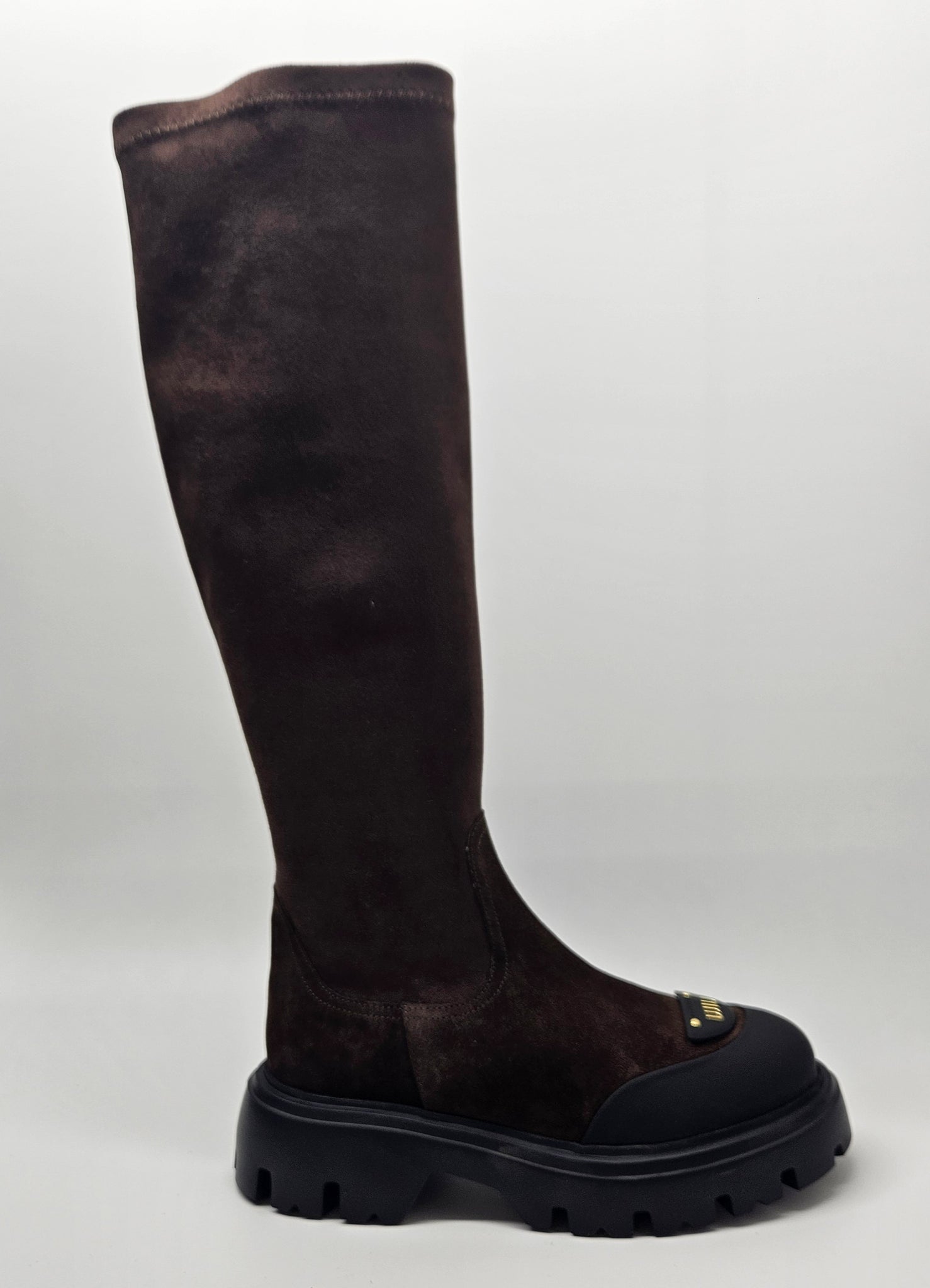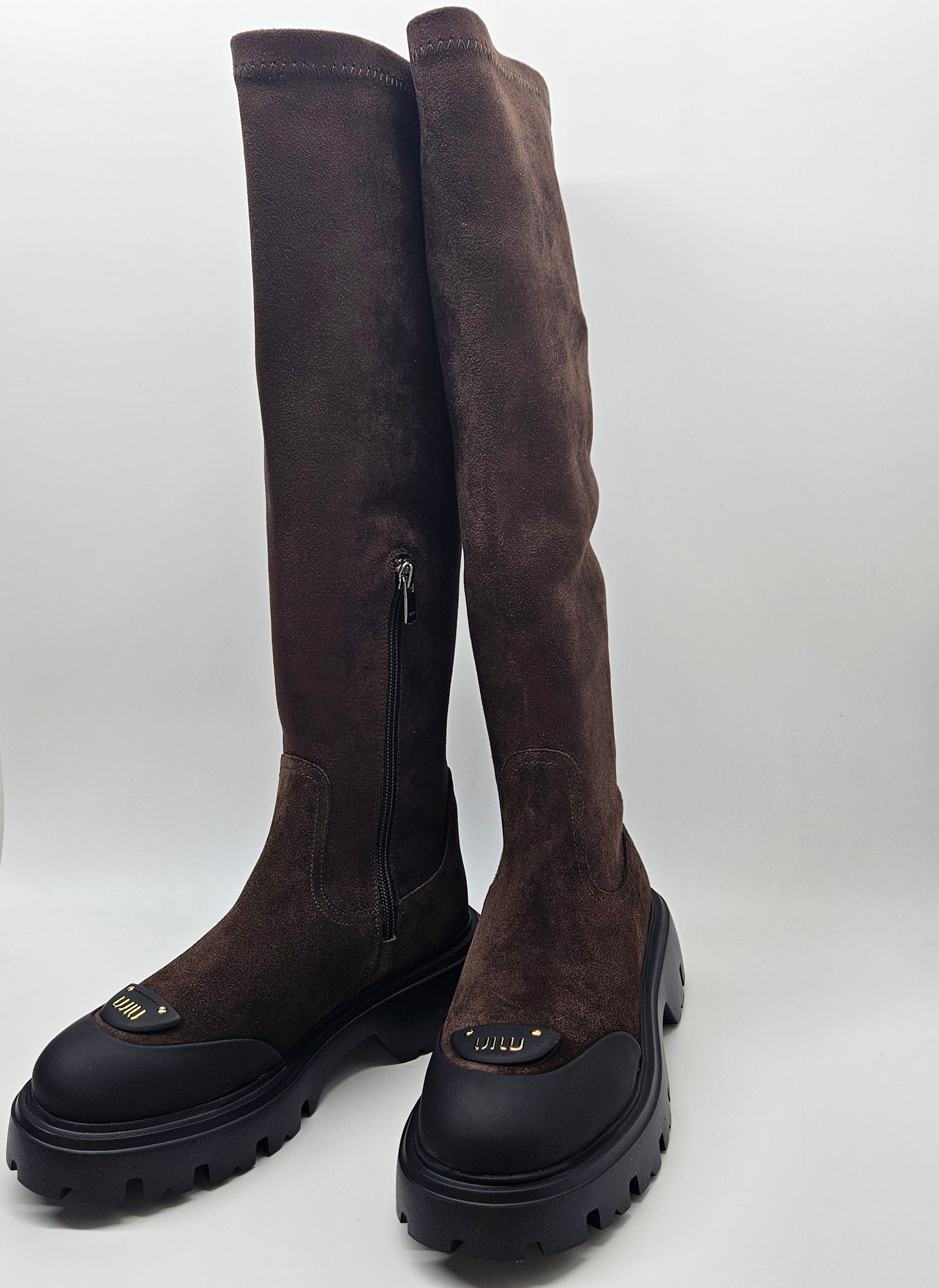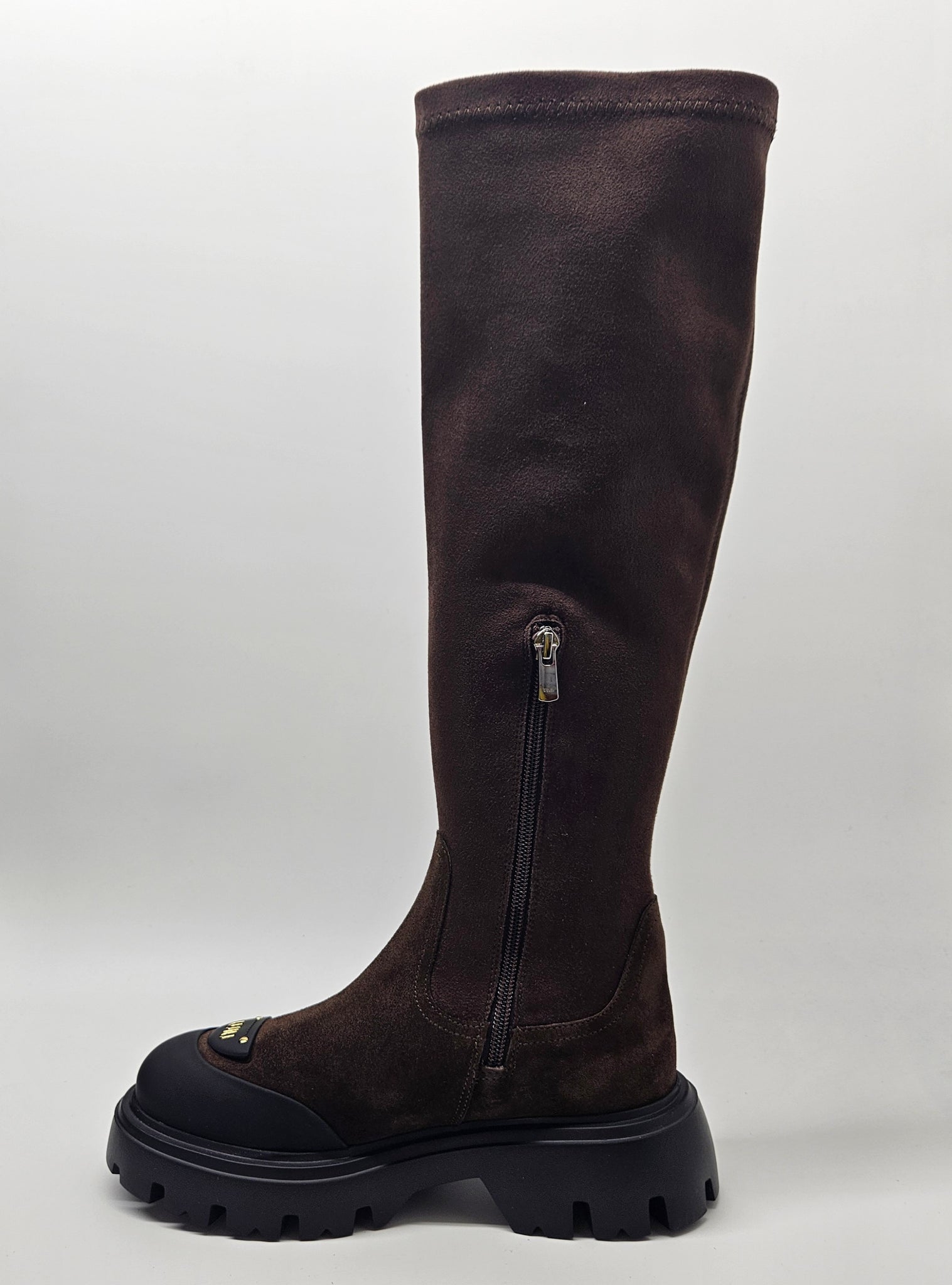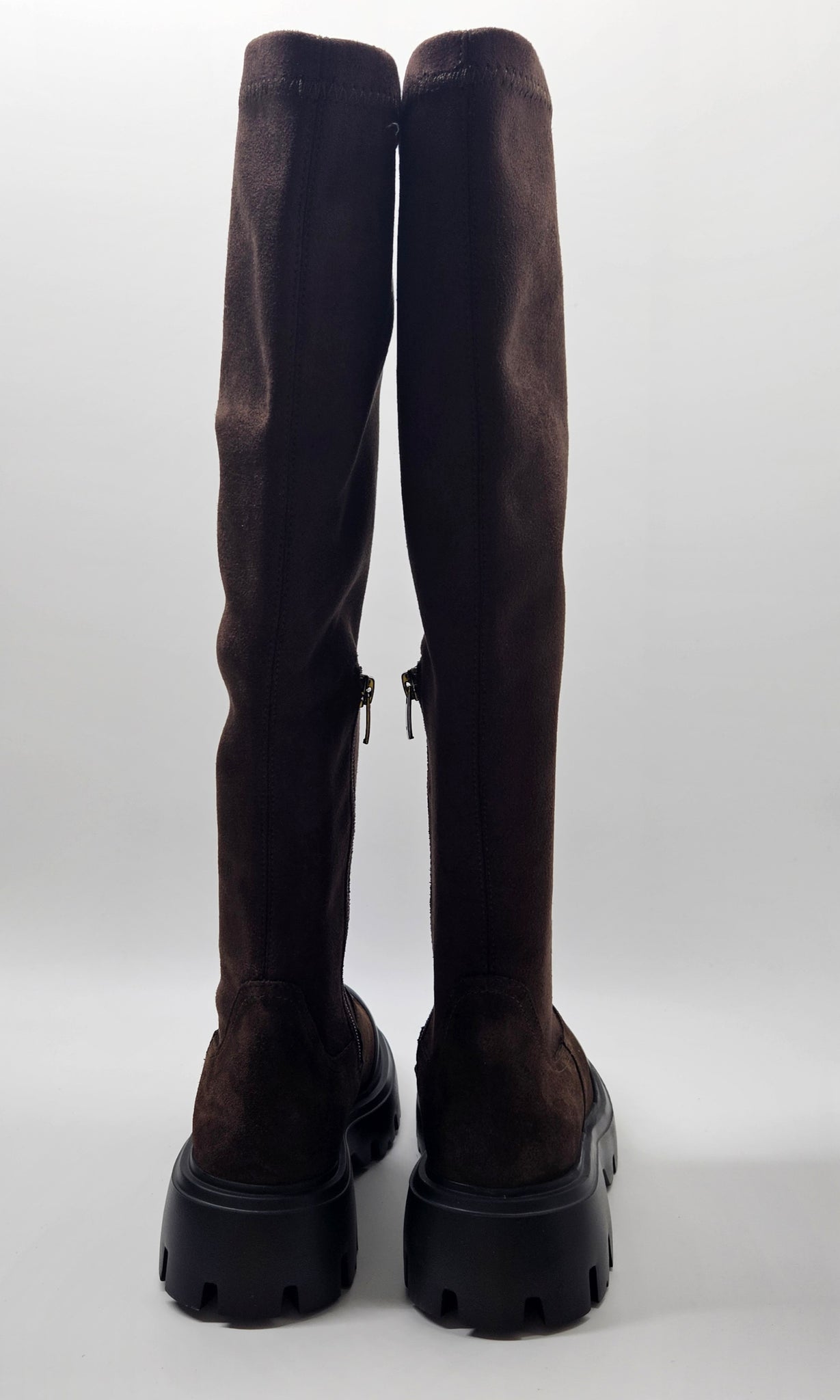 Stilingi, patogūs, natūralios zomšos odos batai. Tinka vidutinio pločio pėdai. Batų aulas tamprus, vidinėje pusėje užtrauktukas. Viduje aplink pėdą minimalus pašiltinimas. Minkštas batų vidpadis. Aukštesnis padas, kurio aukštis 3 cm., kulno 4,5 cm., auliuko aukštis 45,5 cm.