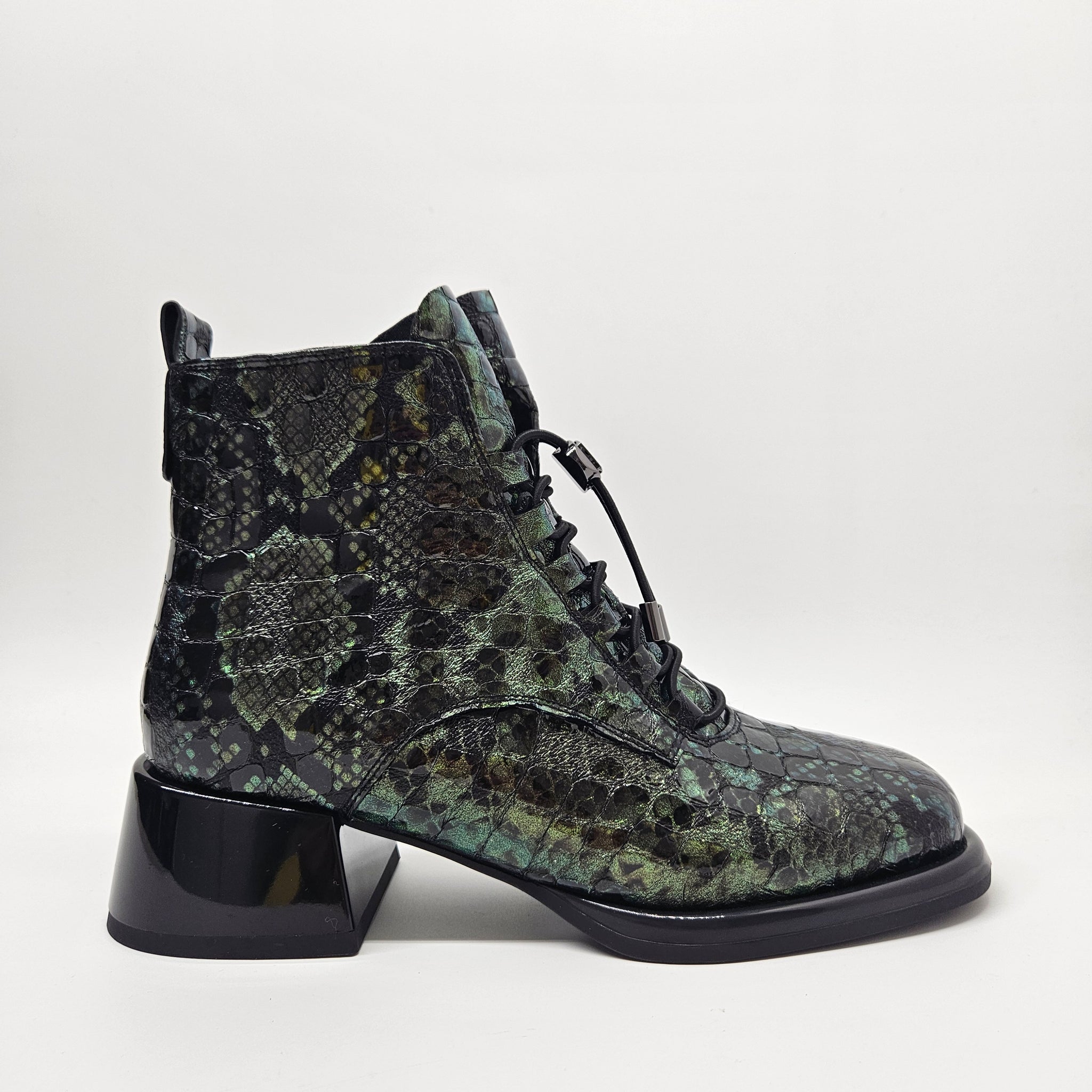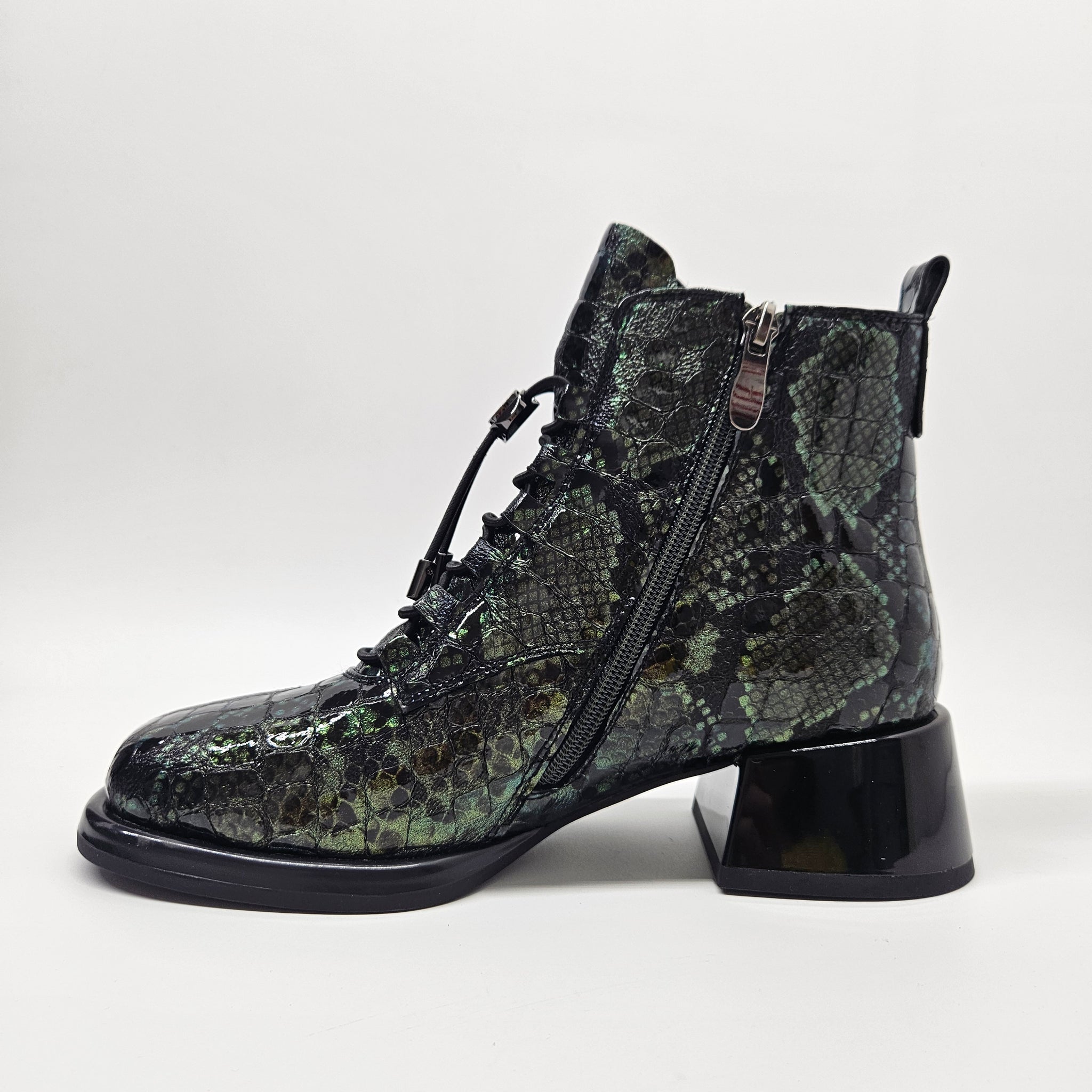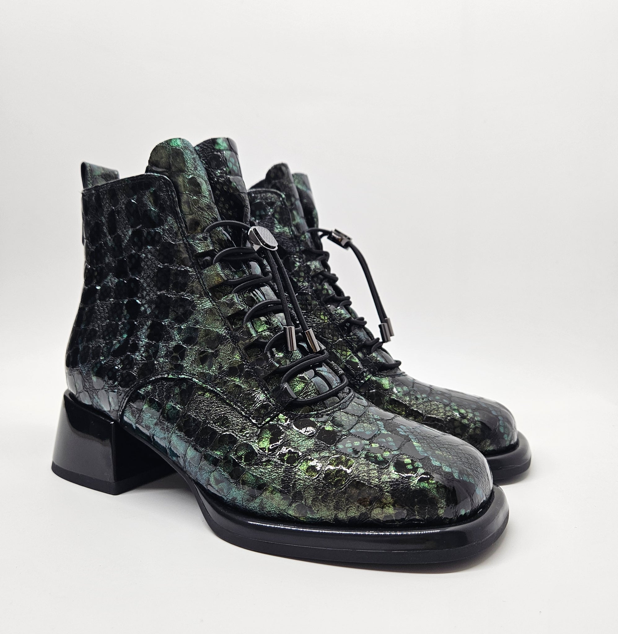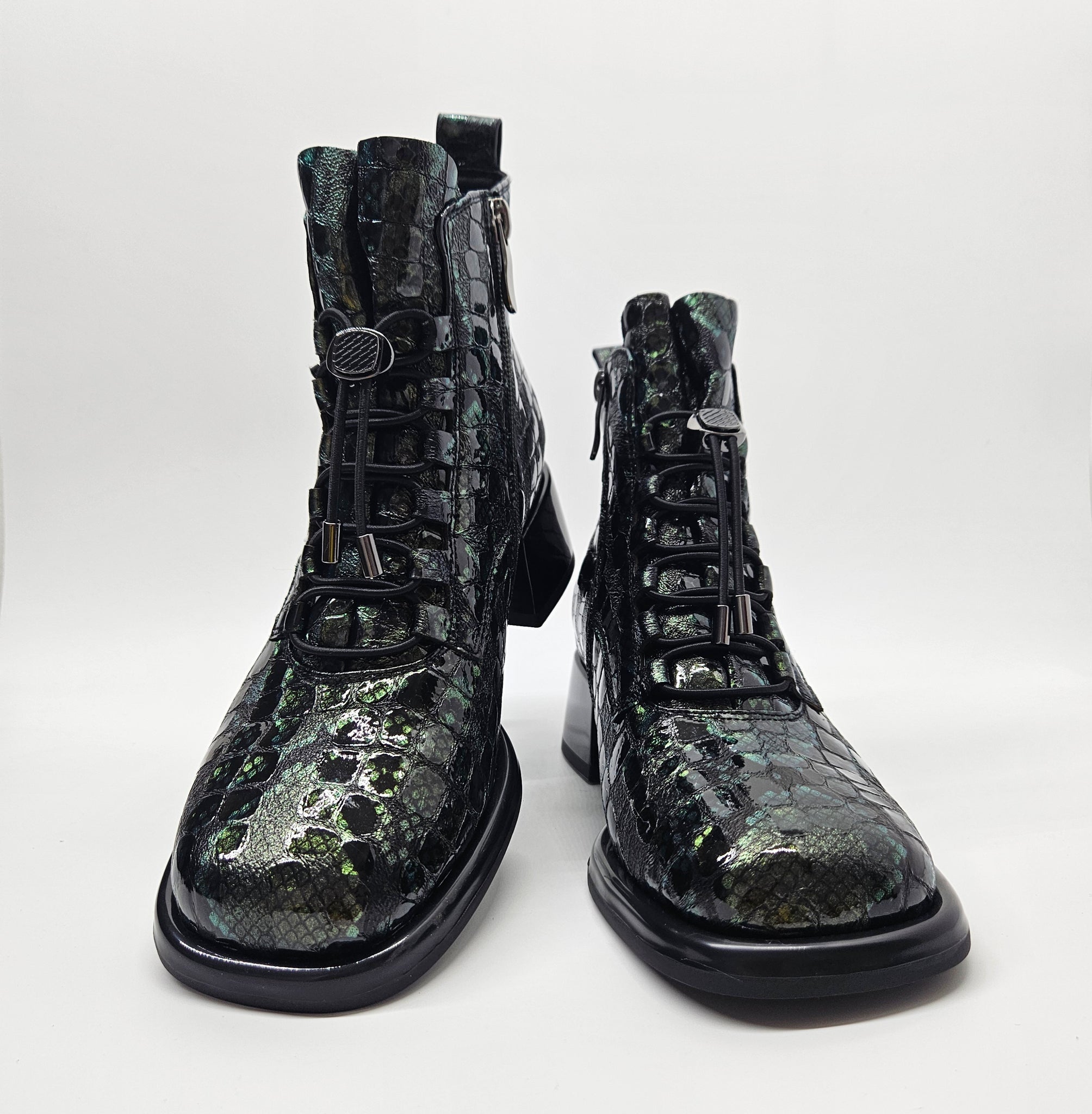 Išskirtiniai savo išvaizda batai. Priekyje, gumytės raištukas su kuriuo galima pasikoreguoti auliuko plotį. Vidinėje pusėje - užtrauktukas. Minkšta viršutinė dalis. Patogūs avėjimui ir tinkantys vidutinio pločio, bei truputį platesnei pėdai. Aulinukų viduje nedidelis, švelnus pašiltinimas. Minkštas vidpadis batų viduje. Stabilus kulnas, kurio aukštis 4,5 cm., pado 1 cm., auliuko 11,5 cm.