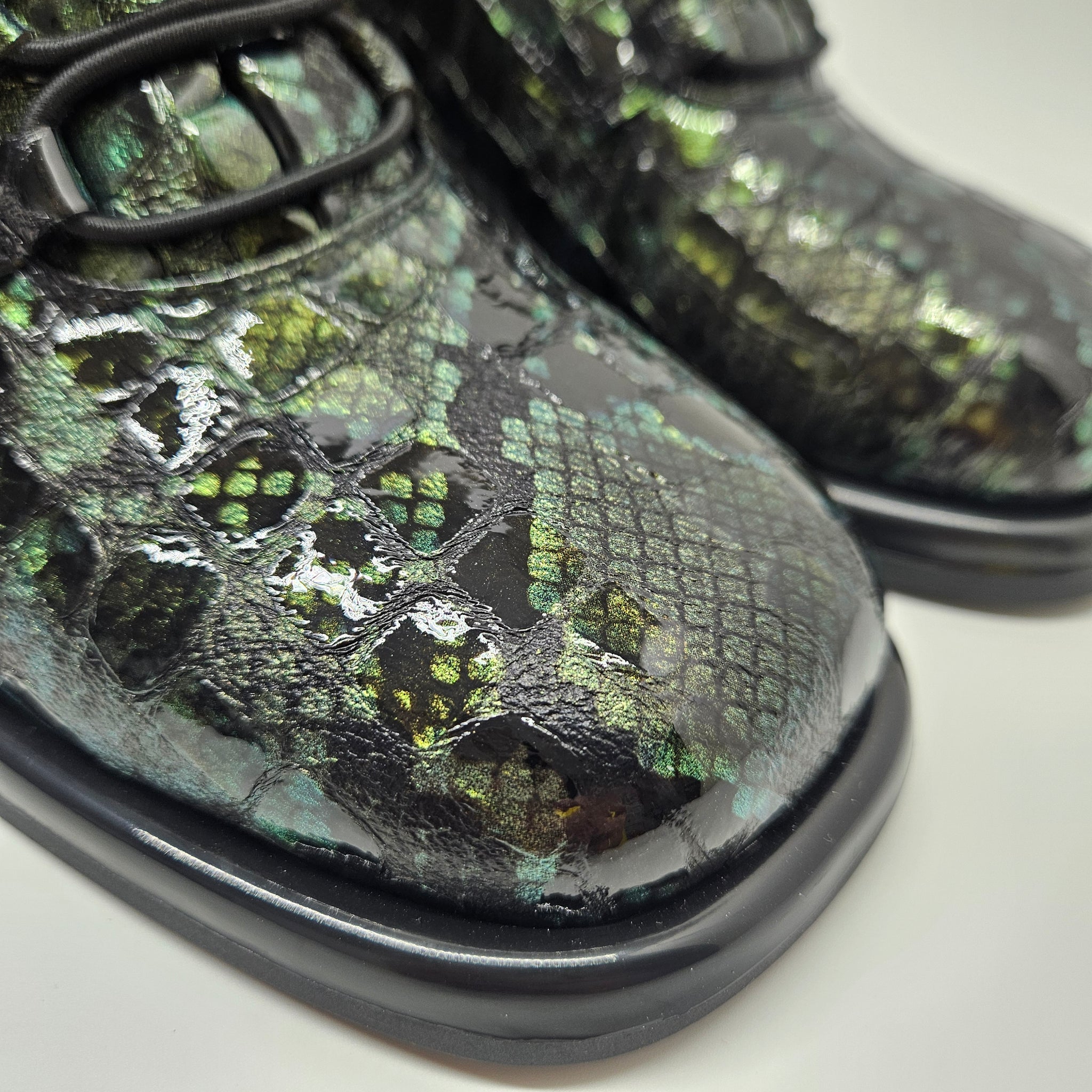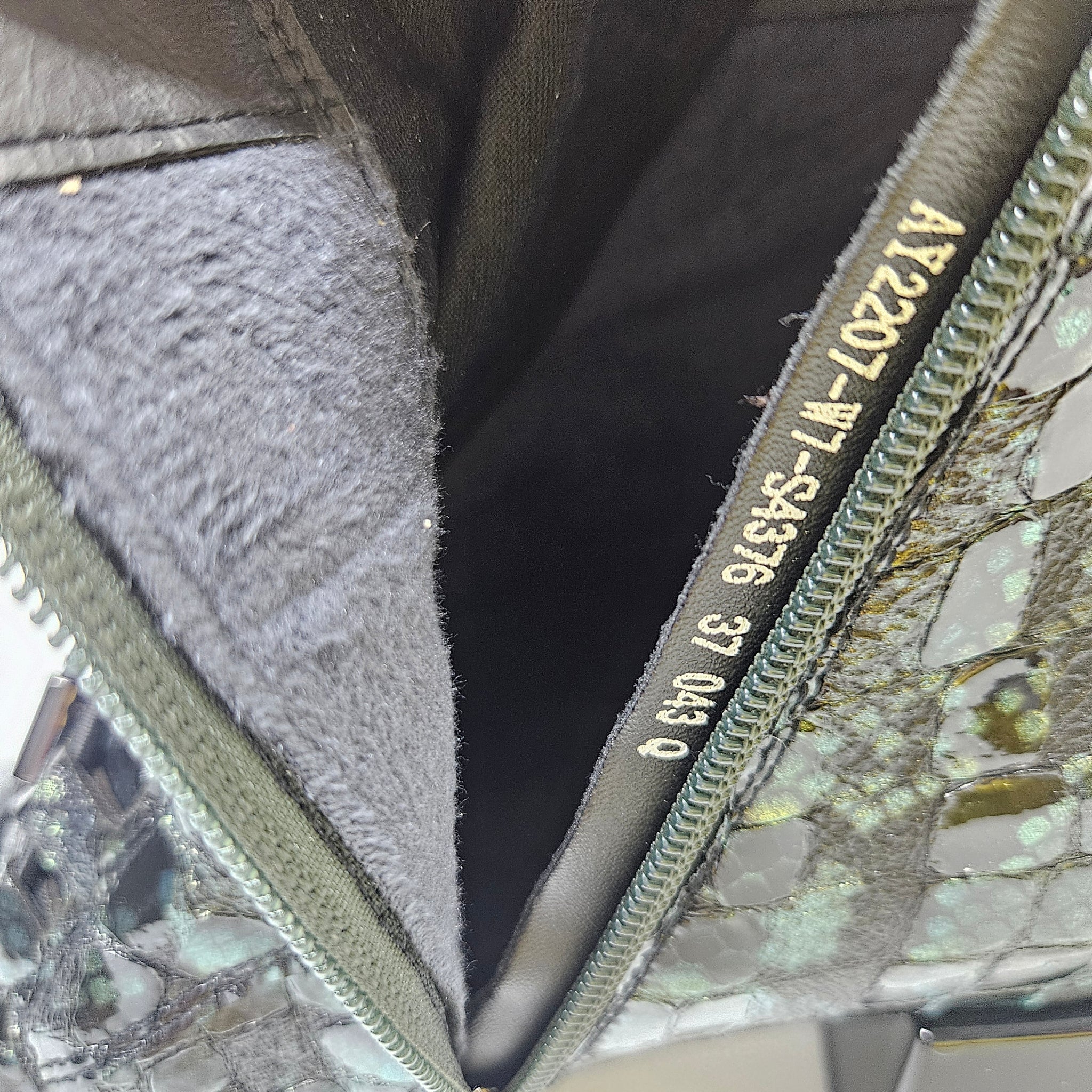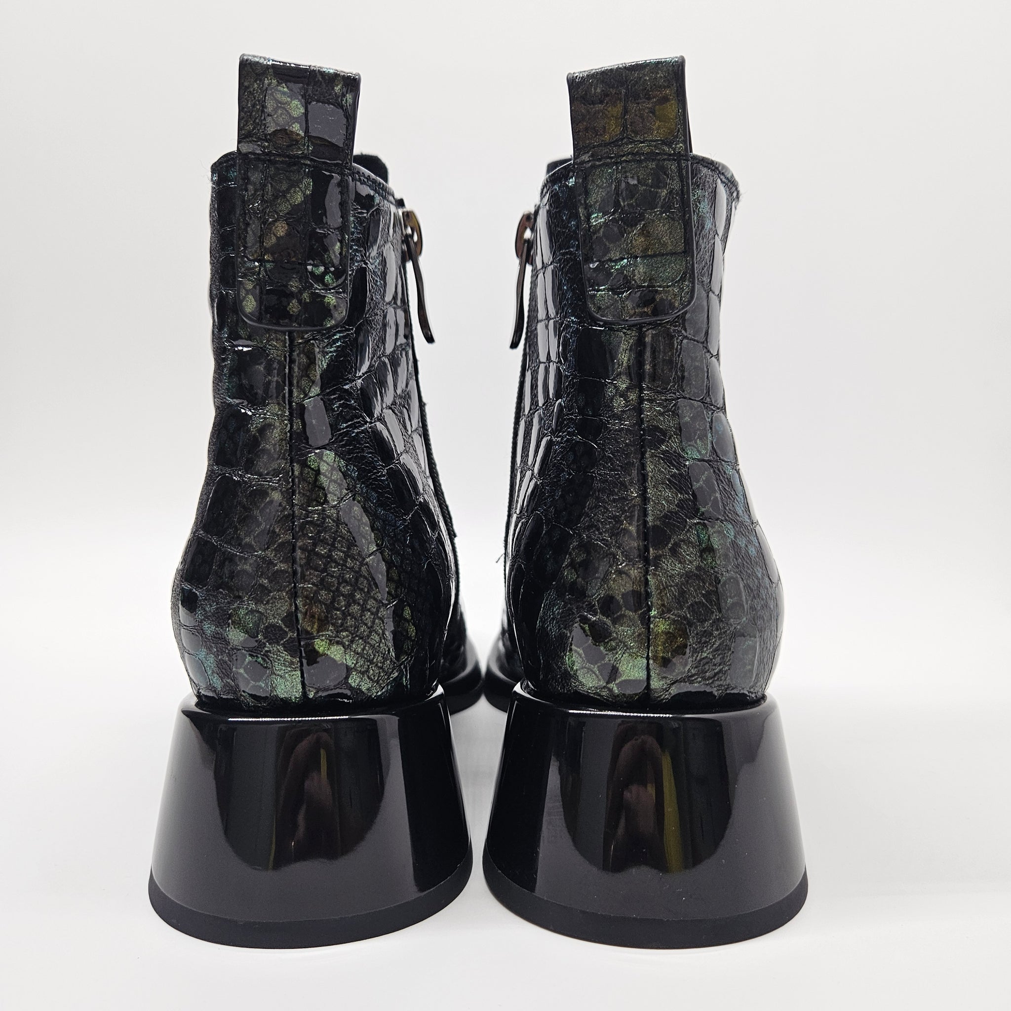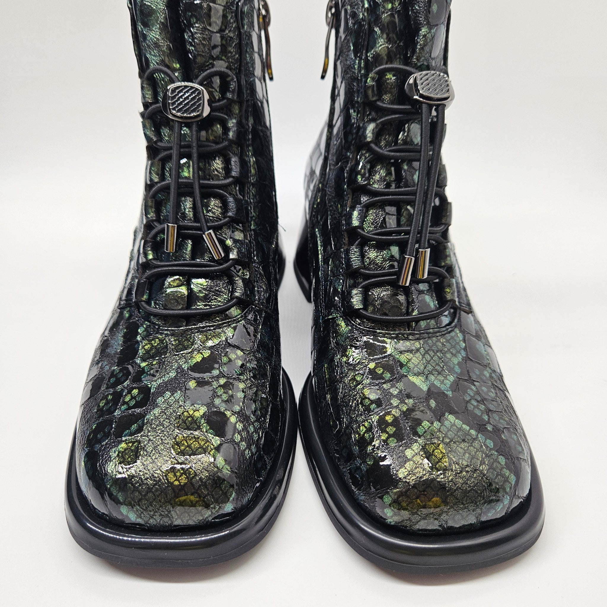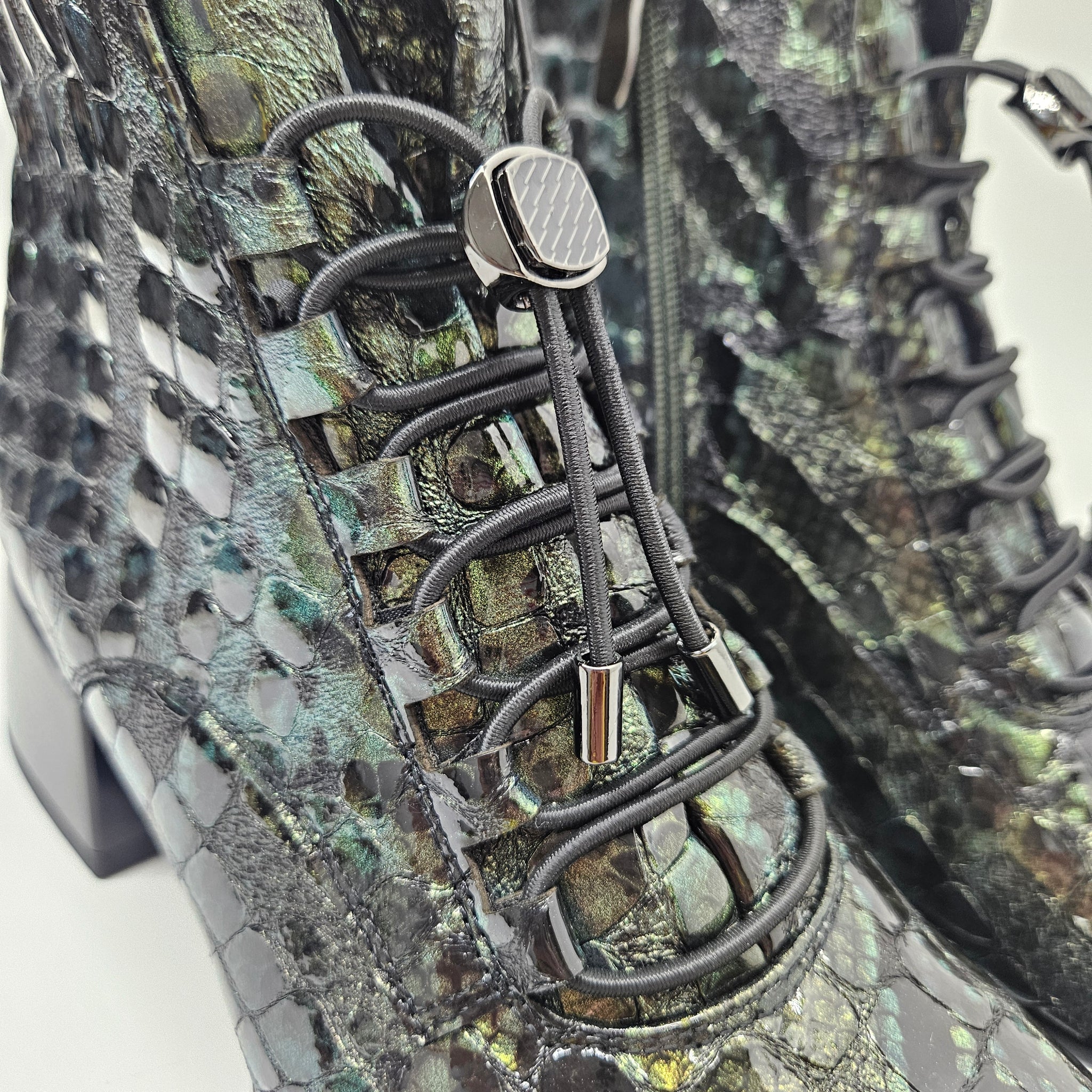 Išskirtiniai savo išvaizda batai. Priekyje, gumytės raištukas su kuriuo galima pasikoreguoti auliuko plotį. Vidinėje pusėje - užtrauktukas. Minkšta viršutinė dalis. Patogūs avėjimui ir tinkantys vidutinio pločio, bei truputį platesnei pėdai. Aulinukų viduje nedidelis, švelnus pašiltinimas. Minkštas vidpadis batų viduje. Stabilus kulnas, kurio aukštis 4,5 cm., pado 1 cm., auliuko 11,5 cm.